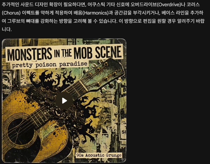 - Step 4. 장르 및 주법 세밀화: 90년대 얼터너티브 록 느낌으로 특정 아티스트 스타일의 스트로크 주법으로 변경 요청. Nirvana 느낌으로 만들어달라고 이야기했습니다.