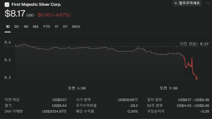 - 요약: First Majestic Silver는 멕시코 내 대형 은 금 광산을 주력으로 하는 북미 최대급 중견 귀금속 광산기업. 최근 메탈 가격 강세와 M&A 효과, 생산성 개선 및 실적 호조로 주목받고 있음. 현금흐름 및 재무구조 안정성과 함께, 2025년 은/금 생산량 가파른 증가와 비용개선이 이어지고 있음. 단 은·금 가격 변동성에 민감한 구조임에 유의.