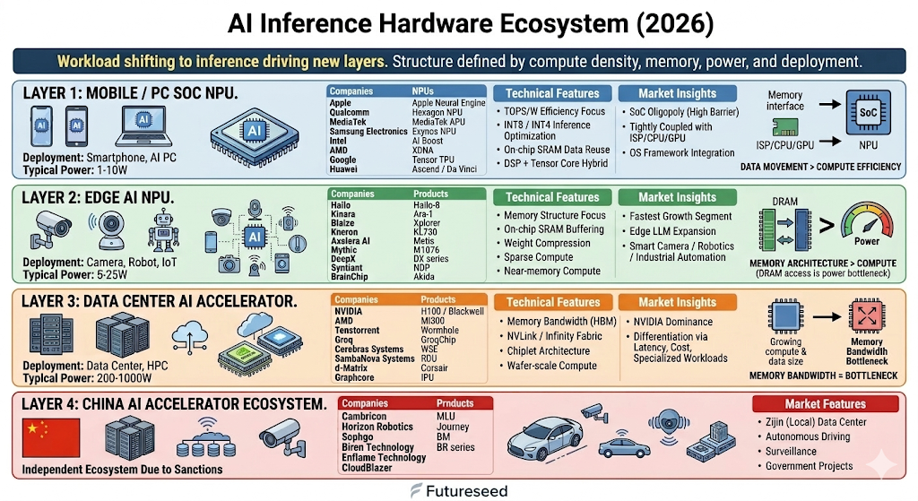 - 기술 인사이트: Edge 환경에서는 DRAM 접근 시 발생하는 전력 소모가 치명적입니다. 따라서 가중치 압축(Weight Compression), 희소성(Sparsity) 지원, 인메모리 컴퓨팅 등 메모리 아키텍처 최적화가 칩 설계의 핵심입니다. 최근에는 sLLM을 엣지단에서 추론하는 Edge LLM 시장이 새로운 동력으로 떠오르고 있습니다.